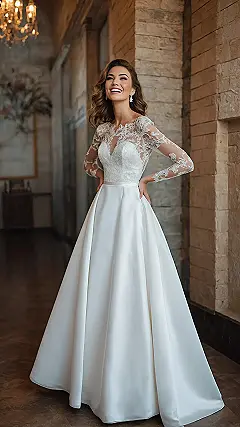 This dress just walked out of a fairytale, didn’t it? With those gorgeous lace sleeves and that perfectly flowing satin skirt, it practically screams “royal wedding” louder than a fanfare. You can totally imagine twirling around a grand ballroom in this, maybe accidentally knocking over a footman with its impressive volume – oops! This isn’t just a dress; it’s a whole mood that says, “I’m about to get married, and yes, I absolutely deserve a crown and maybe a pet unicorn.”