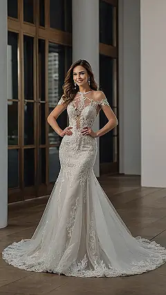 Planning a summer wedding? This dress says “I’m ready to party,” even though it also screams “I’m sophisticated!” It’s like the dress version of that one friend who can rock a math test in the morning and then nail a TikTok dance challenge in the afternoon. Seriously though, with all that lace and the gorgeous train, you’ll be floating down the aisle like you’re on a cloud made of wedding cake.