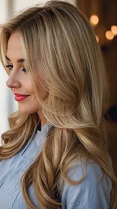 The lady in this picture totally nails the “can’t decide if I’m blonde or brown” look, and honestly, why choose when you can rock both? Her hair is like a perfectly blended smoothie of golden sunshine and rich coffee, flowing down in these awesome waves. It’s the kind of hair that probably gets asked for its autograph because it looks so effortlessly cool. Plus, that super bright smile? It’s practically cheering on her hair, making everything look extra friendly and fun, like she just heard the funniest joke.