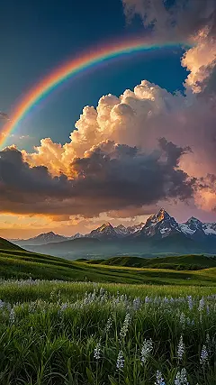 This picture is like a secret portal to the best day ever, even if you’re stuck inside doing homework. Look at that epic rainbow just chilling over those cool mountains, like the sky decided to put on a fancy light show just for you. And those clouds? They look like giant fluffy marshmallows catching the last golden rays of sunshine. Seriously, who needs boring beige walls when you could have this masterpiece screaming “aesthetic goals” as your phone or computer background? It’s basically a free vacation every time you unlock your screen.