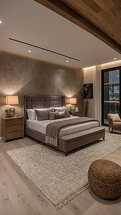 This bedroom is basically a professional-level cozy zone designed to make you hit the snooze button approximately fifty times. Look at that massive bed! It looks so soft, you could probably just fall into it and never be seen again until snack time calls your name. The warm glow from those lamps is like a giant, welcoming hug, practically daring you to try and do something productive instead of snuggling under that textured throw blanket like a burrito.