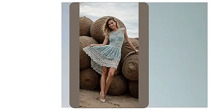 The first thing you probably noticed wasn’t the mountain of giant yarn bales in the background, but that awesome crochet-inspired dress! This isn’t your grandma’s afghan, folks. It’s a super cool, light blue number with intricate patterns that make it look both comfy and totally chic. Our model here is absolutely rocking it, making it seem like she just casually stepped out of a giant craft store, ready for her close-up, proving that handmade vibes can be seriously stylish.