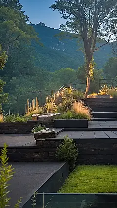 Who knew a deck could be this extra? Forget your average patio chair – this place has multiple levels and some seriously stylish deck planters that are basically VIP lounges for plants. You’ve got everything from those tall, spiky guys that look like they’re auditioning for a sci-fi movie to fluffy, golden grasses that probably get their hair done daily. The clever lighting makes them all glow like they’re ready for their close-up, turning what could be just a flat space into a vibrant, multi-story garden party with a mountain backdrop. Plus, no more awkwardly tripping over pots on the ground!
