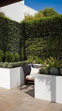Behind these perfectly coiffed green guys, the taller bamboo plants are doing their best ‘secret garden’ impression, giving off major chill vibes and probably whispering plant secrets to each other. It’s like these deck planters are the cute, compact front-row seats, while the bamboo wall is the grand, leafy backdrop. Together, they turn a regular deck into a super private, super green hangout spot, proving that even a row of pots can bring serious style and a touch of jungle adventure to your outdoor space without actually requiring you to wrestle a real jungle.