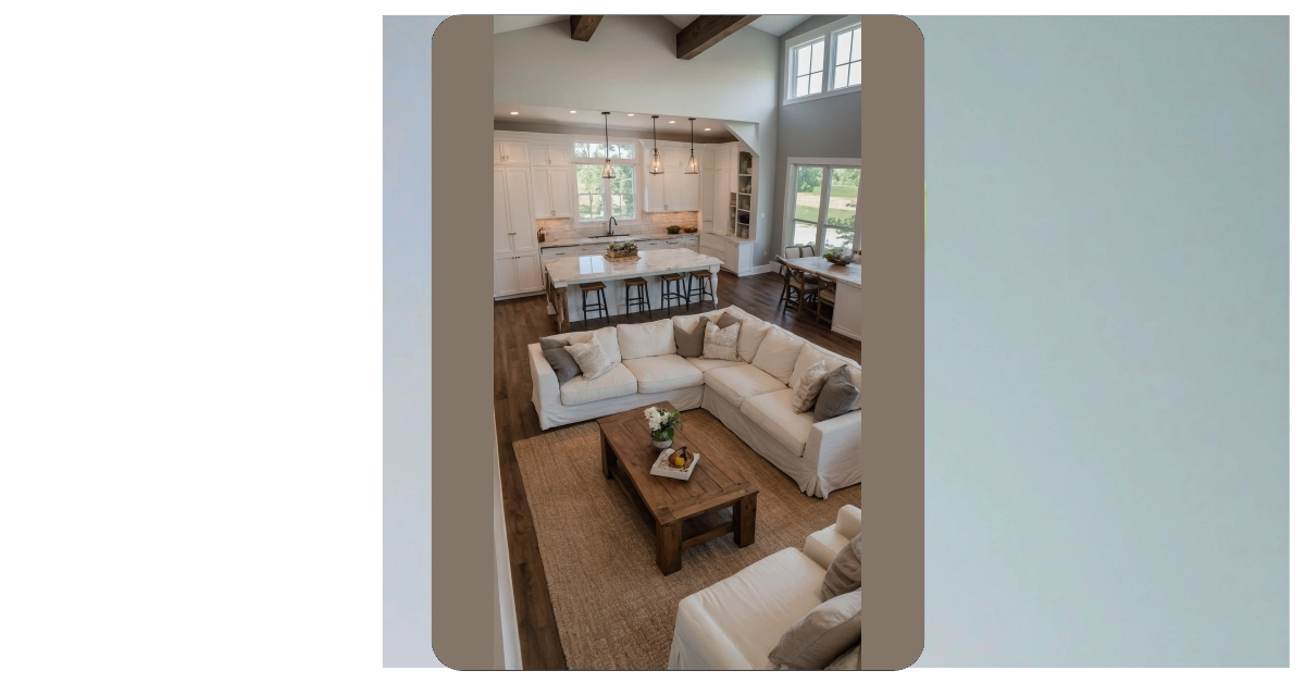 Stepping into this room is like getting a giant, super stylish hug – but from a house, not your weird aunt. You’ve got that massive, cloud-like white sofa just daring you to spill your soda, and those awesome rustic wood beams up top that make the whole place feel like a super cool, fancy barn. It perfectly blends that fresh, clean modern look with cozy farmhouse vibes, meaning it’s totally the spot where you can binge-watch your favorite show or pretend you’re a grown-up sipping tea, all while looking effortlessly cool.