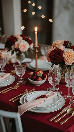 This table looks like it’s ready for a really fancy date night, doesn’t it? All those deep red roses and flickering candles are practically shouting, “Get ready for some serious swooning!” You’ve got the rich maroon tablecloth setting a super cozy mood, and those shiny gold plates are definitely a huge step up from your usual dinnerware. If you’re ever planning a romantic dinner that actually looks like it came straight out of a movie, this is pretty much the blueprint. Just try not to get too distracted by the ambiance and accidentally drop your spaghetti on the gorgeous greenery – that would *not* be cute.