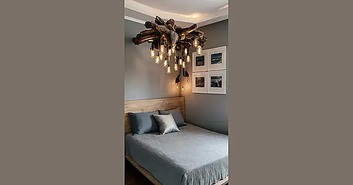 That bedroom’s got a chill vibe with a twist – check out that totally extra driftwood chandelier! It’s like someone said, “Hey, let’s bring the beach inside and also make it light up!” Talk about a conversation starter. Imagine trying to explain *that* to your friends when they come over; “Yeah, I just found it washed up on shore… with electrical wiring already attached!”