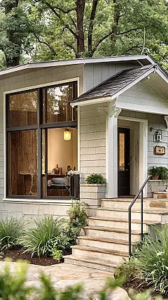 Look at this beauty! This isn’t just any tiny house; it’s practically a design magazine cover with a personality. Those giant, cool-looking windows reaching up to the roof are basically screaming, “Let there be light!” It’s like the house is trying to soak up every single ray of sunshine and maybe even gently spy on the squirrels having acorn parties in the big trees nearby. You might think a small house means tiny everything, but this one clearly got the memo about making a grand statement, proving that big style definitely comes in small packages.