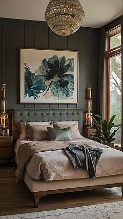 Seriously, though, who needs a vacation when you have this? The dark green walls are surprisingly calming, paired with the warm, inviting lighting and those cool art pieces. It’s like stepping into a peaceful rainforest at night. Plus, that bed looks unbelievably comfy – I bet you could spend a whole weekend there without moving, which honestly, sounds like a pretty good plan to me. Just add some rainforest sounds, and you’ve got yourself the ultimate relaxation station.
