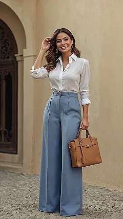 Look at this outfit! Those wide-leg linen pants in that cool blue color look like they’re basically giving a standing ovation to comfort. Pairing them with a crisp white shirt? That’s like the fashion equivalent of putting your feet up after a long day – totally relaxed, but still looking super sharp. You know those days where you want to feel comfy but still look like you could walk into a fancy cafe without anyone batting an eye? Yeah, this linen pants outfit totally nails it. No awkward jeans moments here, just smooth, breezy style ready for anything.