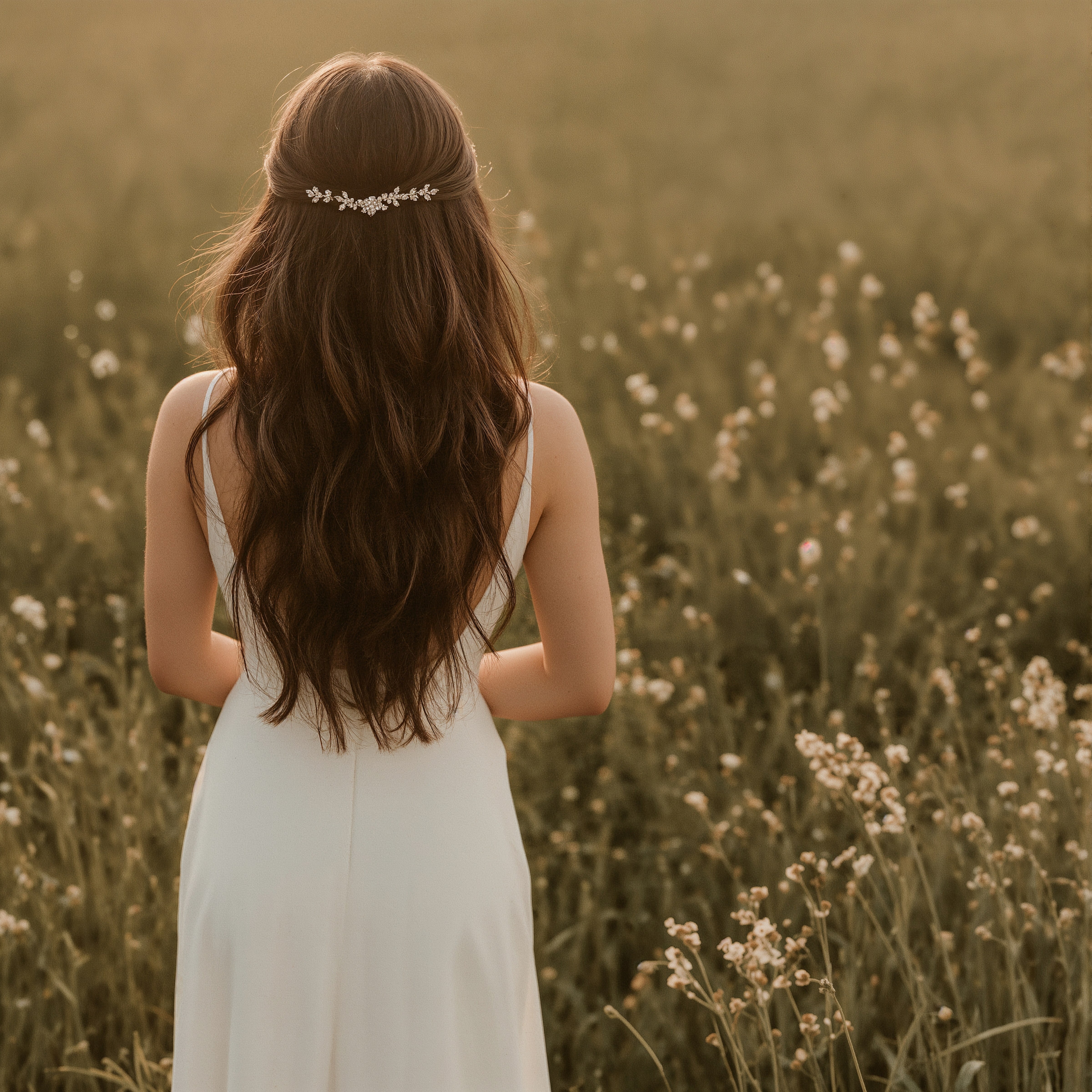 Discover the magic of Bridal Hair Down Waves, an approach that feels both free-spirited and sophisticated, ideal for outdoor settings or pairing with delicate accessories. The wedding hair half pulled back option adds a touch of refined structure to this beloved, flowing aesthetic.