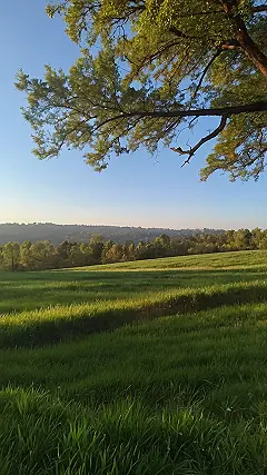 This picture is like a postcard from a super chill place – imagine a field of grass so green, it practically glows, stretching out under a sky so blue it’s almost unbelievable. A friendly tree hangs out in the foreground, looking like it’s posing for a nature magazine photoshoot. The whole scene is peaceful, quiet, and perfect for a nap – if you were a cow, you’d probably be snoring away in this lush green paradise!