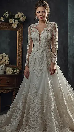 Thinking about all the work that goes into designing a gown like this is kind of mind-blowing. Every little detail, from the intricate lace on the sleeves to how the veil flows just perfectly, had to be planned out by a super talented fashion designer. It’s not just sewing; it’s like crafting a wearable piece of art that makes you feel like royalty, even if you might need a few friends to help you carry the train. That’s some serious bridal dress fashion design magic right there.