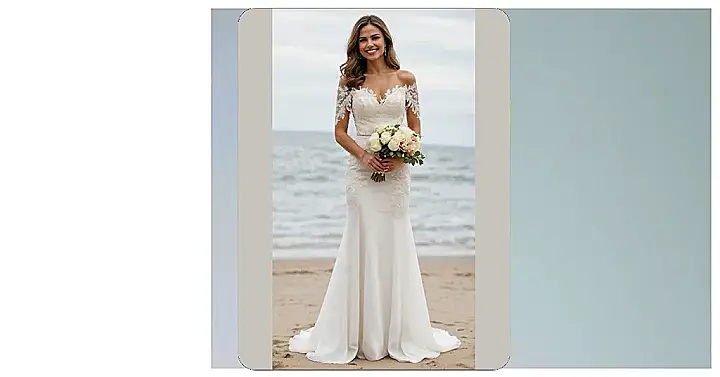 And don’t even get me started on the top – that stunning lace adds just the right amount of ‘wow’ without making you feel like a fancy doily. It’s like the dress whispered, ‘I’m going to make jaws drop, but in a very sophisticated, Instagram-ready kind of way.’ The sheer sleeves and off-the-shoulder look add enough sparkle to be unforgettable, showing off that modern elegance. It’s the perfect blend of ‘I’m here to marry my soulmate’ and ‘Also, I could totally walk a red carpet in this without a stylist.’ Total wedding glow-up material!