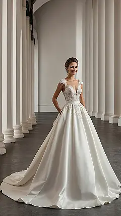 Check out this incredible ivory wedding dress! It’s got so much beautiful lace and flowy fabric, it looks like it could float down the aisle all by itself. Wearing something this stunning must feel like you’re starring in your own fairy tale, complete with a train that probably needs its own bodyguard just to keep it untangled from enthusiastic flower girls or rogue confetti. It’s the kind of dress that makes you feel like a total queen, ready to conquer the world (or at least the dance floor).