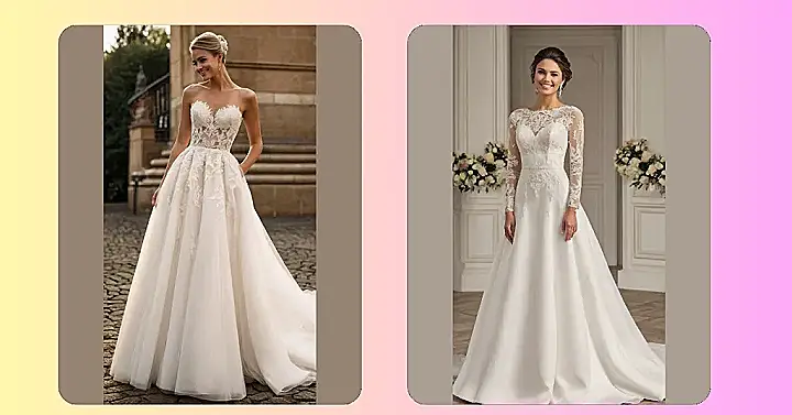 Thinking about dress shopping? This long dress has got you covered, literally! With all that gorgeous lace and the train that goes on forever, you’ll be turning heads and maybe even tripping a few unsuspecting guests (oops!). But hey, if you’re gonna make an entrance, make it a grand one, right? Plus, it’s got sleeves, which means you can skip the arm day at the gym before the big day. Win-win!