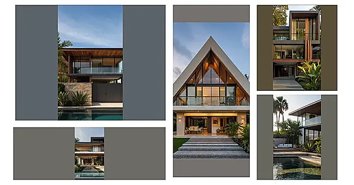 And just look at that A-frame roof! It’s like someone took a giant triangle and said, “Let’s make it a house!” It reminds me of those super cool treehouses you see in movies, only way more luxurious. I bet the inside is just as awesome, with maybe a comfy hammock or two tucked away somewhere, so you can truly relax in this modern tropical paradise.