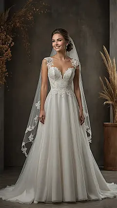 Walking in this kind of ivory gown probably makes you feel like you’re floating, especially with that long, flowing veil behind you. Holding that pretty bouquet of flowers just adds to the whole fancy vibe. It’s the kind of outfit that makes you stand a little taller and maybe feel a little bit like a princess, even if you’re just trying not to step on the hem. Just don’t try to do any cartwheels in it, unless you want to become one with the floor.