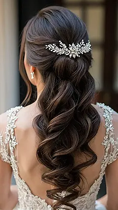 Imagine having hair that can stop traffic, but in a good way, like when you’re walking down the aisle! This hairstyle is all about those beautiful waves, giving you that chill, ‘I woke up like this, but actually spent hours getting ready’ kind of vibe. It’s like your hair is saying, “Yeah, I’m elegant, I’m wavy, and I’m about to get married!” And that sparkly clip? Total game changer, adding just the right amount of bling to let everyone know who the star of the show is.