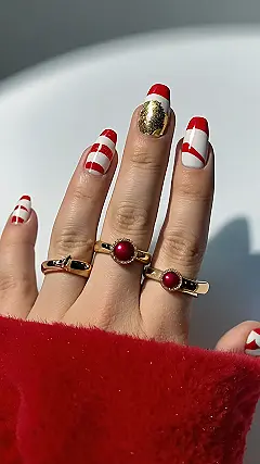 And check out those rings! Those deep red stones totally match the festive nail theme. It’s like the whole hand is ready for a holiday party. You could totally rock these with your favorite holiday sweater and jingle all the way to Christmas dinner. Who needs mistletoe when you’ve got this much holiday sparkle?