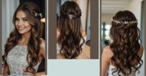 Taking a peek at this gorgeous hair, you can tell it’s ready for some serious autumn wedding vibes! With those perfectly woven braids creating a fancy crown at the back, it’s like she’s got a hidden secret garden party happening on her head. Then, get ready for the grand reveal: a cascade of beautiful, bouncy curls that just scream ‘I’m here to look fabulous and maybe steal a few hearts!’ This half-up, half-down magic means you get the best of both worlds – elegant enough for the ceremony, but totally ready to hit the dance floor without your hair falling flat faster than a pumpkin spice latte on a hot day.