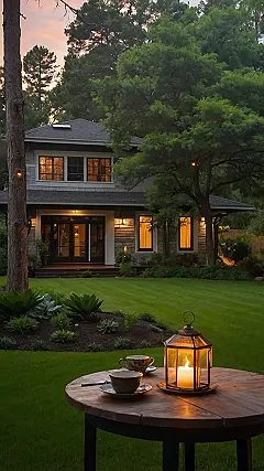 This picture perfectly captures that feeling. A beautiful Canadian home, warm and inviting with its lit windows, sits serenely amongst the trees, promising stories of cozy nights and family gatherings. The carefully manicured lawn shows the love and care put into the garden, a perfect example of the beauty you can find in Canada. And that little tea party scene? It adds just the right touch of whimsical charm, showing that even the simplest moments can be incredibly special in a beautiful Canadian home garden.