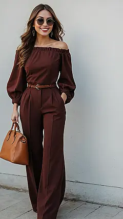 This lady is basically giving a masterclass in ‘chic looks’ with zero effort, or at least making it look that way! That off-the-shoulder jumpsuit in that rich brown color is so cool, like wearing your fancy pajamas but looking ready for anything. Add sunglasses and a cool belt and bag, and BAM, instant fashionista vibes. Maybe if I wear this, my homework will do itself? Probably not, but a girl can dream while looking this sharp.