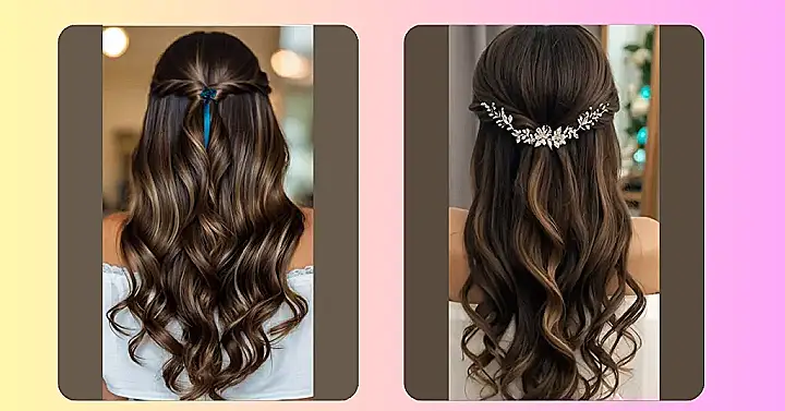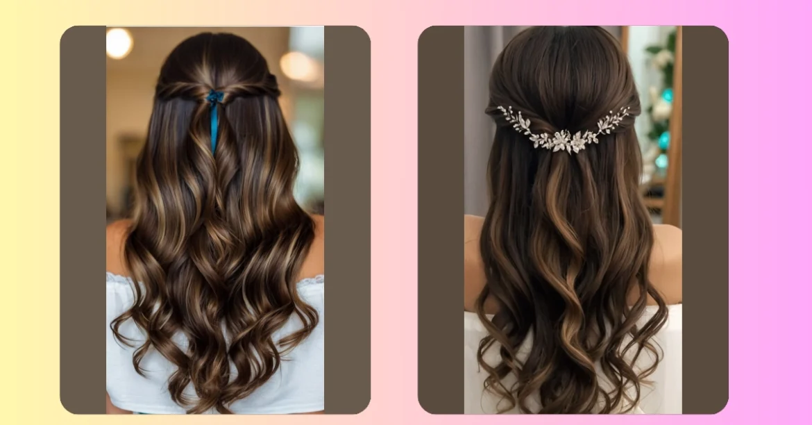 This hairstyle is so amazing, it’s practically begging to be featured in a fairytale! Just look at those luscious, wavy locks! They’re like chocolate waterfalls cascading down the back. And that little teal ribbon? It’s the perfect finishing touch, like a tiny, elegant bow on a perfectly wrapped present. You could totally rock this look at a wedding—your own, maybe? Or even your bestie’s!