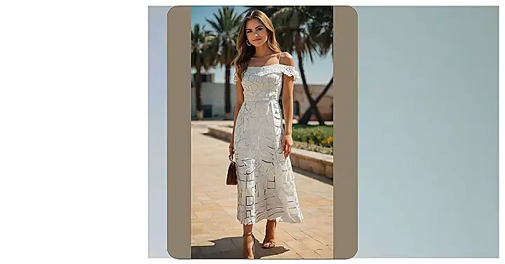 This elegant midi dress looks like it’s straight out of a fairy tale! It’s the kind of dress you’d wear to a super fancy school dance or when you want to impress your crush (or maybe even your grandma!). With its off-the-shoulder design and delicate floral patterns, it’s basically the “glow-up” of dresses.
