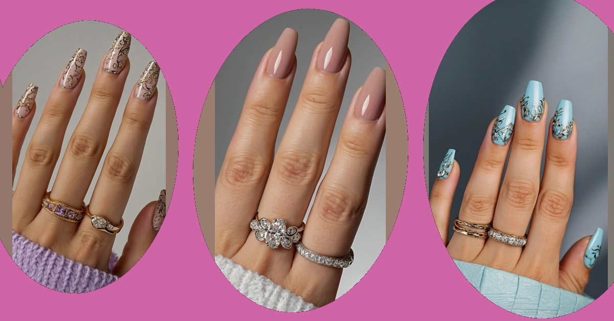 And just when you thought the nails were doing all the heavy lifting, those rings swoop in like the ultimate wing-women! The sparkly bands are having a major moment, shining so bright they could practically guide Santa’s sleigh (a little early, but you get the idea!). They add that extra touch of fancy to the already chic nails, proving you can be both understated and dazzling at the same time. It’s the ideal combo for anyone wanting to add a little sparkle to their fall vibe, whether you’re heading to school or just conquering your to-do list in style.