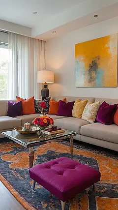 And if the pillows weren’t loud enough, that giant painting on the wall is basically yelling happy colors at you! This isn’t the kind of room where you whisper; it’s where you brainstorm epic plans, maybe even attempt a questionable TikTok dance. It’s proof that making your living room funky doesn’t mean it has to look like a yard sale; it just means giving it a personality that’s as bold and awesome as that bright purple footrest chillin’ on the floor. Totally beats staring at plain walls while scrolling your phone, right?