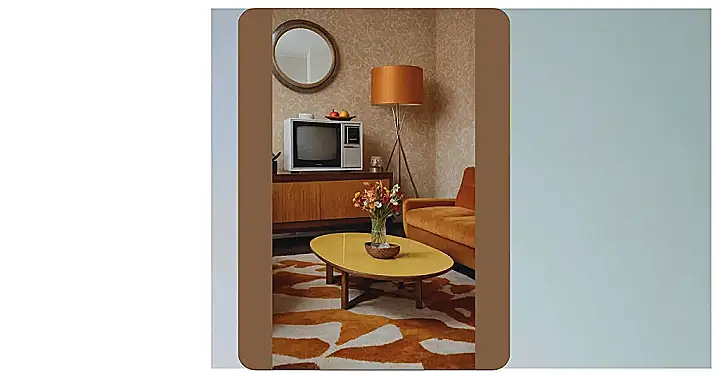 Check out this place! It looks like a living room threw on a disco outfit and decided to party. Forget boring walls and plain furniture; this room is rocking serious personality with its wild patterns and bright colours. That orange sofa looks like the comfiest giant pumpkin ever, and the sunny yellow coffee table is practically screaming “Put your snacks here!” Plus, there’s an ancient TV sitting on a cool wooden cabinet – you might need a remote control the size of a brick to change the channel, but imagine the classic shows you could pretend to watch!