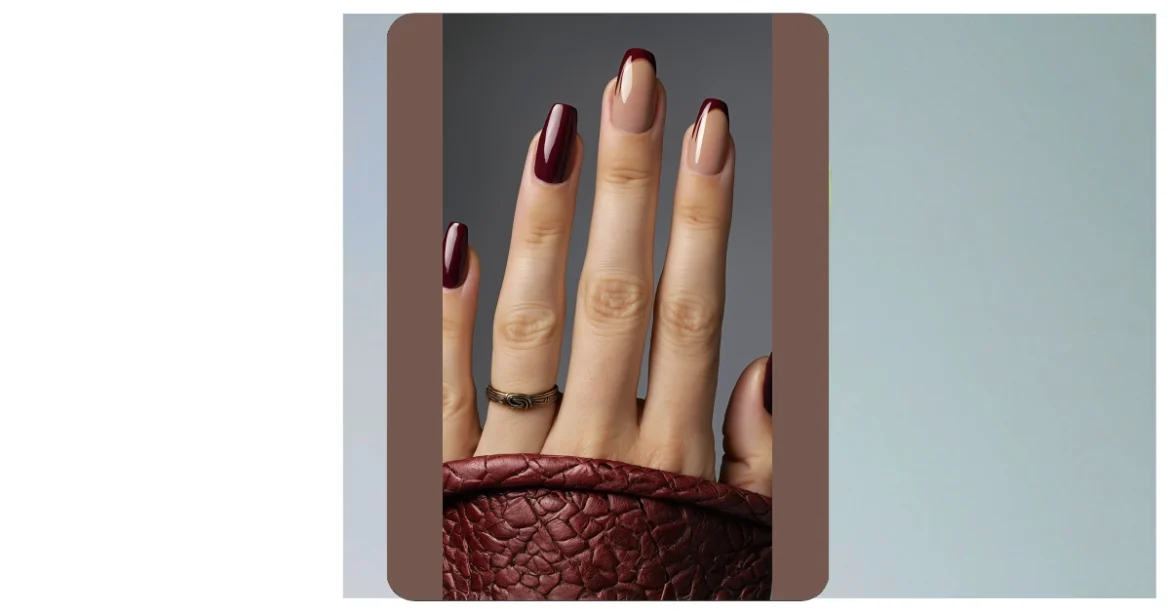 Who knew nails could be so chatty? With this trendy look, featuring those rich, dark red shades and the clever nude-and-tip design, your hands are practically begging for a secret-sharing session. Plus, that cool ring on your finger and the textured red fabric in the background make the whole vibe feel a bit mysterious and super stylish. You’ll be ready to swap stories and spill the beans (or not!) at the lunch table, looking totally on point without even trying too hard. These nails aren’t just pretty; they’re conversation starters, perfect for a little friendly gossip.