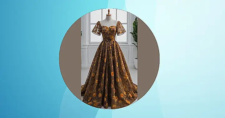 Check out this epic long frock! This thing has so much fabric, you could probably hide your entire friend group under that skirt during hide-and-seek. The brown colour with the fancy yellow flowers looks like it belongs in a historical romance movie or maybe a really fancy picnic where ants would be terrified of ruining your look. Those flutter sleeves are practically asking for a dramatic slow-motion turn, just try not to get tangled up or knock over any furniture while you’re swirling around like a floral tornado.