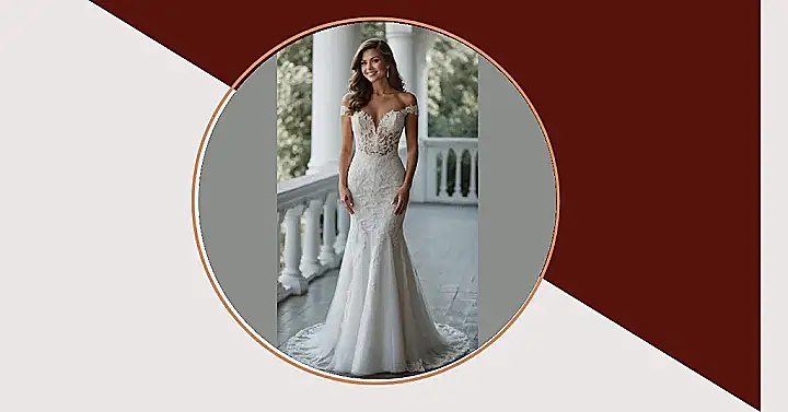 Peeking a little closer, you can see all the fancy lace that makes this dress extra special, especially on the top part. It’s got that ‘wow’ factor without even trying! Plus, that off-the-shoulder look is super chic and makes her look like she’s floating on air. We’re pretty sure wearing a mermaid wedding dress means you get to skip leg day at the gym for a week, because moving in it probably counts as a full workout. Just be careful when you’re going for the bouquet toss – you might need a little extra momentum to make sure it clears the crowd!