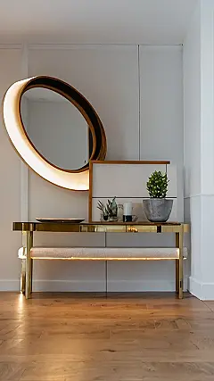 Check out this living room vibe! It’s got everything you need to make your space look super cool without breaking the bank. The table looks like it’s made of pure gold, and the plants sitting on top are basically just showing off at this point. I wonder if the mirror is like a portal or something? It’s definitely more interesting than your average rectangle.
