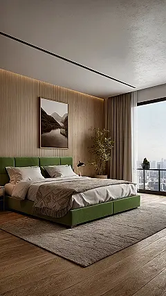 Forget those days of your room looking like a tornado had a slumber party. This isn’t just a bedroom; it’s a ‘zen wood retreat’ where even your socks would feel too fancy to be left on the floor. With those slick wood panels everywhere, it’s like sleeping inside a really cool, giant treehouse, but without the risk of splinters. Just imagine waking up to sunlight peeking through that long window, instead of the alarm clock’s evil glare. It’s so perfectly put together, you’d think it was ready to pack up and go… wait a minute, that sounds familiar!