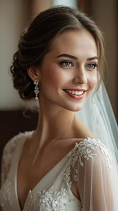 Plus, let’s be real, who has time to worry about every single strand being perfectly straight when you’re getting married? There are way more important things, like making sure you don’t trip walking down the aisle or figuring out how to eat cake gracefully in a fancy dress. The hair in this picture looks amazing because it’s got personality, rocking a sparkly hairpiece and shiny earrings that basically scream, “I’m ready for my close-up!” Whether your hair ends up straight as an arrow or decides to go wild and wavy, the goal is just to look and feel awesome, maybe even with a little bit of unexpected flair.