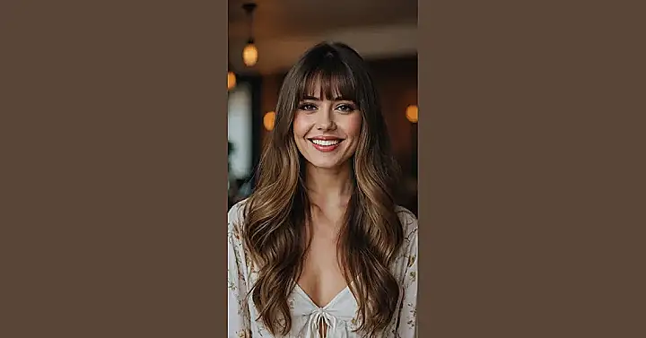 Looking at this picture, you can almost hear the compliments rolling in! Her long, wavy hair is super dreamy, but let’s be real, those bangs are doing some heavy lifting. They’re not just hanging there; they’re like the VIP section for her super bright smile, perfectly framing her face and making her eyes sparkle. This kind of soft, face-framing magic is exactly why curtain bangs are still having their moment – they give you that effortlessly chic look without making you feel like your hair is trying to take over your whole face.