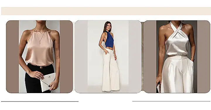 You know those days when you want to look super put-together but also feel like you’re wrapped in a cloud? This halter top outfit totally gets it! The silky, light beige top is practically whispering, “I’m fancy, but I also enjoy a good movie night.” It’s the kind of top that makes you feel instantly polished without having to spend hours figuring out what to wear. Just pop it on, and boom – instant style upgrade, no complicated fashion math required to look this effortlessly chic in a cool women’s halter top.
