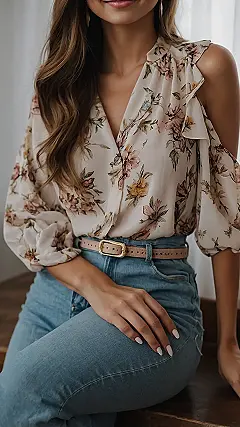 This gorgeous floral blouse is practically a garden party all by itself, but way less pressure than actually attending one. It’s the kind of top that makes you feel instantly fancy, like you could accidentally walk onto a movie set and totally fit in. Plus, check out those ruffly bits and the little shoulder peeks – they’re basically saying, “Yep, I know I look good, and no, it didn’t take me five hours.” Seriously, wearing something this pretty just feels like winning at getting dressed.
