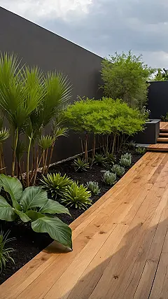 Staring at this backyard, you might think a fancy landscape architect spent a million hours on it, but nope! This is proof that “simple backyard” doesn’t mean boring. It’s got that sleek, dark wall playing the perfect backdrop to a lineup of vibrant green plants, making them pop like superstars. It’s the kind of outdoor space where even your laziest Saturday self could manage to keep things looking sharp – seriously, those plants basically water themselves, probably.