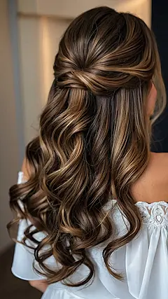 Want to look like you stepped out of a fairytale on your big day? This hairstyle is like a secret weapon for instant elegance. It’s got the perfect blend of sophistication up top, and those gorgeous flowing waves down below make you look like you’re floating on clouds. Plus, it’s got that little tied-back bit which is like a hairstyle handshake – professional, but still ready to party!