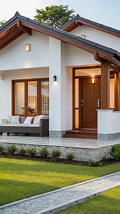 Forget everything you thought you knew about bungalows being strictly one-floor wonders. This house clearly got the memo about staying cool and comfy, but decided to add a little extra spice – literally, it’s got layers! With its dazzling white walls looking fresh enough to eat a mint off, and those rich wooden accents that scream “I’m stylish, but I also love naps,” this place is basically a modern-day fairytale house. The sloping brown roof just begs for a storybook character to peek over it, or maybe just a really comfy spot to watch the clouds drift by. It’s got that classic bungalow charm but with a cool, airy vibe that makes you want to immediately kick off your shoes and stay awhile.
