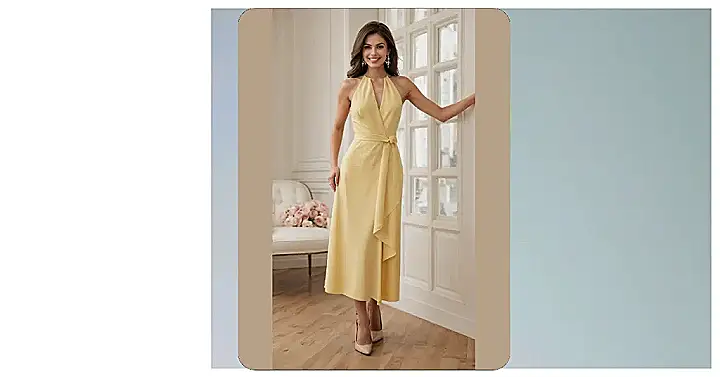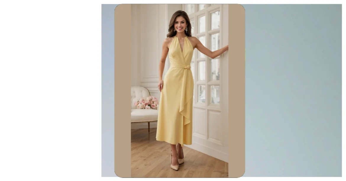 Who knew a dress could look as delicious as a pat of butter on warm toast? This butter yellow dress is absolutely radiating sunshine, and honestly, the model’s mega-watt smile just makes it even brighter! She’s totally owning that elegant halter-neck style with a super chic wrap detail at the waist that probably ties itself into a perfect bow, because some clothes are just magical like that. Paired with those sparkly earrings that catch the light like tiny disco balls and those sleek nude heels, she looks ready to float into any fancy event or just gracefully lean against a window, looking fabulous. It’s the kind of outfit that says, “I’m here to shine, but in a really cool, understated way.”