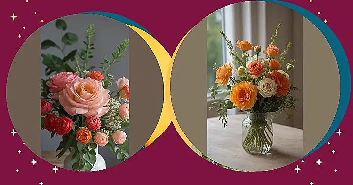 Check out this flower arrangement – it’s like these petals decided to throw the most epic color party! You’ve got the big, fancy peach roses strutting their stuff front and center, while the smaller red and orange ones are all crowded around, probably whispering secrets and giggling. It’s definitely not just a random bunch of stems shoved in a vase; someone clearly had a master plan to make these beauties look this good. They’re basically saying, “Look at us, we’re fabulous, and we know it!”