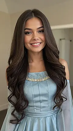 Now, let’s talk about that wavy goodness. The curls in the image are giving off major Cinderella vibes. They are big enough to look glamorous but not so big you can’t bust a move on the dance floor. And with the right hairspray (aka magic potion), they’ll last all night, even after you’ve attempted the Macarena for the tenth time. Prepare for some major hair envy from your squad!