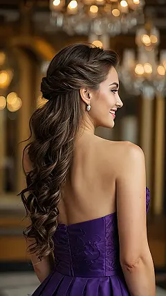 Having your hair perfectly styled like this means you can totally focus on your date instead of secretly checking your reflection every five minutes. Imagine laughing at a hilarious joke they tell, and your curls just bounce perfectly without getting stuck in your lip gloss – total win! This elegant look, paired with a gorgeous strapless dress like the purple one in the photo, gives off major ‘I’m confident and ready to have fun’ vibes. So go ahead, order that messy dessert; your hair will stay flawless, allowing you to charm them with your wit, not just your fabulous locks!