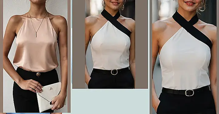 You know those days when you want to look super put-together but also feel like you’re wrapped in a cloud? This halter top outfit totally gets it! The silky, light beige top is practically whispering, “I’m fancy, but I also enjoy a good movie night.” It’s the kind of top that makes you feel instantly polished without having to spend hours figuring out what to wear. Just pop it on, and boom – instant style upgrade, no complicated fashion math required to look this effortlessly chic in a cool women’s halter top.