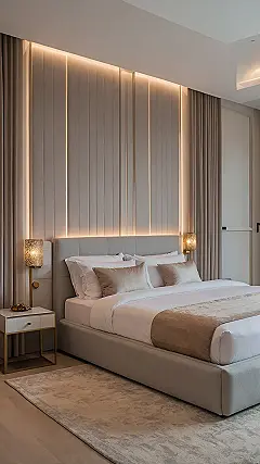 Beyond the irresistible bed, the whole vibe of this deluxe room just screams ‘fancy slumber party’! Those sleek wall panels with the hidden glowy lights make the room feel super modern, like you’ve stepped into a secret VIP lounge. And those funky gold lamps? They look like they’re ready to host their own tiny disco, or at least help you find your phone without stubbing your toe. It’s the kind of place where even your socks would feel special, definitely a step up from a regular room, making every moment feel extra awesome.